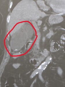 CTで胆のうが大きく腫れ、炎症を起こしています。