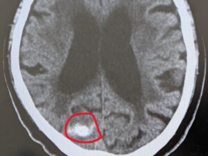 頭部CTで脳出血を認め、総合病院に搬送しました。