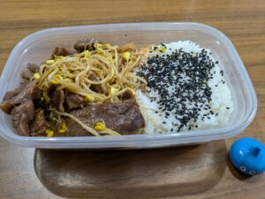 豆もやし焼肉、ゴマ塩多め弁当