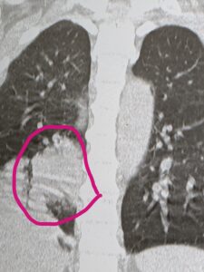 CTで、右の肺に腫瘍を認め、総合病院に紹介しました。